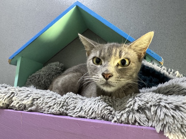 I have a very serious face you see but a very sweet temperament! I can be a little shy at first but give me time and I am a real smooch and a curious girl! I love to give the staff here lots of kisses and head bops! I also work fulltime at the Biscuit Factory, so if you adopt me, just know I have to make my daily quota of Biscuits. My ideal day would be spent snoozing on your couch or in a sunbeam all day and getting pats and scratches when you get home, and of course lots of food! I would love a home with kids that know how to give me my space until I feel safe. Staff haven't seen me interact with other cats, but a slow and proper introduction should ensure I get along with an existing kitty in your home.