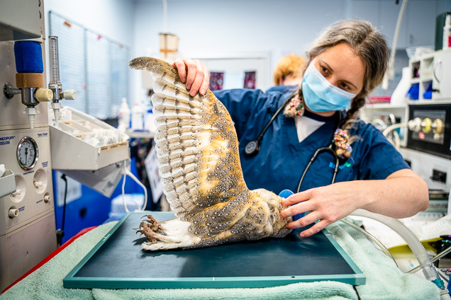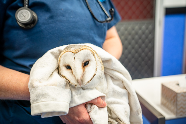 The barn owl, affectionately named Hedwig, was transported to the RSPCA Wildlife Hospital for a vet check over. Wildlife Vet Meaghan inspected the bird for any wing issues or trauma and checked its vitals such as heart, lungs and eyes. Although pleased with what she sees, she expresses concern around the knowledge the owl spent so long in the baited warehouse.