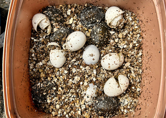 Three eggs were damaged during the laying process. Two could not be saved. But Annette carefully taped one together. And it was a long shot! This broken egg was almost certainly non-viable.